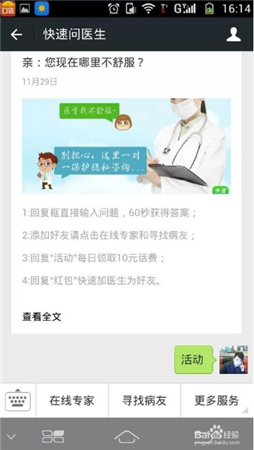 進去之后你就會看見如下圖所示界面,你可以分別回復(fù)1234試一下效果,如果有什么身體問題可以在線咨詢啊,那我們就回復(fù)活動兩個字啊