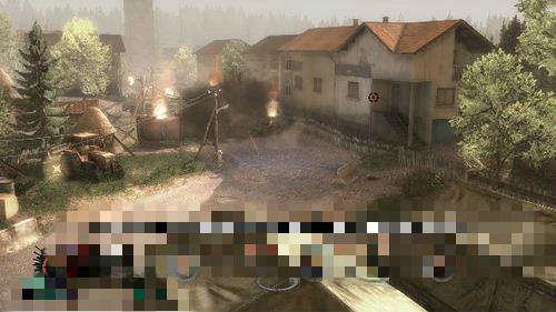 搞完后,與另一股敵人對(duì)峙,注意迫擊炮攻擊(有紅色圓圈),清理完再在高處敲敵人,不要急于沖下去,之后在裝甲車與坦克攻擊不到的高處攻擊他們,將其打爆。