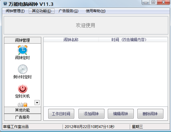 萬(wàn)能鬧鐘軟件不僅包含電腦鬧鐘、倒計(jì)時(shí)鬧鐘、定時(shí)關(guān)機(jī)、迷你時(shí)鐘,還涵蓋了很多娛樂(lè)工具,如天氣預(yù)報(bào)、萬(wàn)年歷、備忘錄等