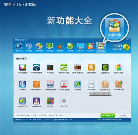 360安全衛(wèi)士9.0是整個團隊的心血之作。在此,感謝之前所有熱心用戶的意見和建議,你們給了衛(wèi)士很多幫助,也是我們前進的源動力!最后,希望大家新版使用愉快,360安全衛(wèi)士還能帶給用戶更多驚喜!更新日志: