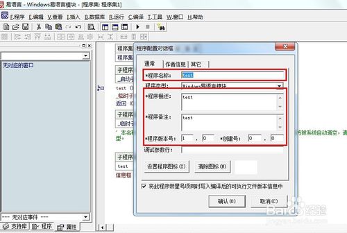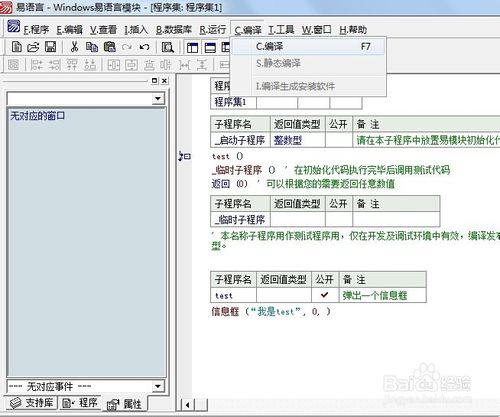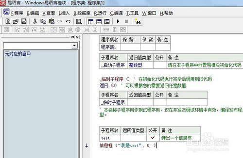 開(kāi)始“實(shí)兵演練”,可通過(guò)單擊鼠標(biāo)右鍵彈出菜單并選擇“新建子程序”或者按下Ctrl+N鍵的方式來(lái)新建子程序,今天我們就新建一個(gè)名叫“test”的子程序,這里有必要說(shuō)一下相關(guān)注意事項(xiàng):(1)子程序的名字要唯一(2)根據(jù)子程序的需要,設(shè)置返回值的數(shù)據(jù)類(lèi)型,如果無(wú)返回值,可留空。(3)設(shè)置子程序的公開(kāi)屬性,模塊是方便其他程序猿調(diào)用的,所以公開(kāi)要打勾。(4)為了便于程序的開(kāi)發(fā)編寫(xiě),做好備注是個(gè)好習(xí)慣。提示自己及其他人此子程序的功能是什么。接下來(lái),就是寫(xiě)代碼了,我們就以信息框?yàn)槔?寫(xiě)完代碼記得將公開(kāi)打“√”和添加備注。