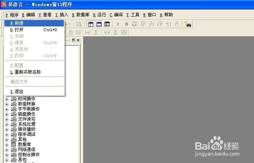將易語(yǔ)言安裝好后,打開(kāi)一個(gè)易語(yǔ)言的程序,鼠標(biāo)左鍵單擊菜單【程序】>>【新建】,從建一個(gè)新的程序開(kāi)始,如下圖所示。