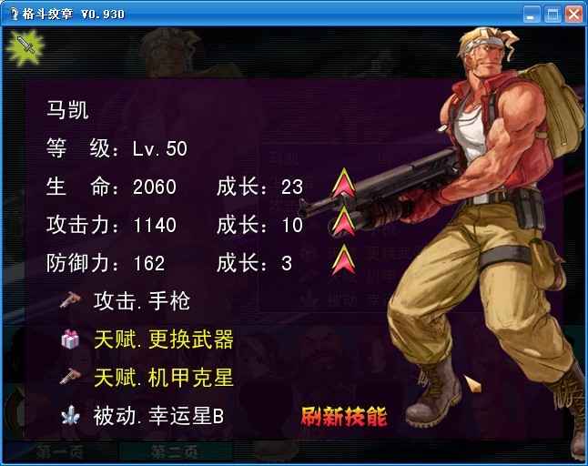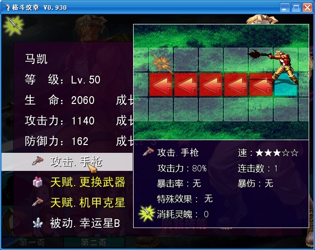 然后是他的技能,三個(gè)自帶技能中有兩個(gè)是被動的天賦技能,其中一個(gè)是機(jī)甲克星。很好,戰(zhàn)車什么的在他手上撐不過兩回合,配合其他角色的攻擊基本上能作出秒殺。另一個(gè)被動技能是生成一張更換武器的卡片,光靠小手槍當(dāng)然不行,他強(qiáng)大的地方就在于換出的武器上。目前能換出的武器有:沖鋒槍、手雷、火箭炮以及街機(jī)里常用的……小刀。換出來的武器在屬性面板里沒有說明,所以攻擊數(shù)值只是猜測