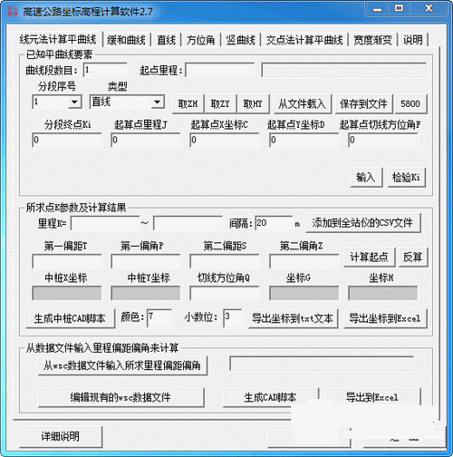 高速公路坐標(biāo)高程計(jì)算是在多年的施工放樣工作中總結(jié)出來(lái)的一個(gè)很有效的程序,是一款功能非常強(qiáng)大的計(jì)算軟件,可以幫你完成直線、圓曲線、緩和曲線(完全緩和曲線和不完全緩和曲線)、S形曲線、復(fù)曲線、試車(chē)場(chǎng)高速環(huán)道布勞斯曲線的中樁和任意長(zhǎng)度、任意角度邊樁坐標(biāo)和高程的計(jì)算,并可根據(jù)你有要求加任意點(diǎn)的坐標(biāo)。計(jì)算方法根據(jù)曲線是否完整對(duì)稱(chēng)可以選擇交點(diǎn)法計(jì)算和特殊點(diǎn)計(jì)算方法。生成的坐標(biāo)成果可以直接通過(guò)數(shù)據(jù)線導(dǎo)入全站儀,也可以導(dǎo)入Excel中便于打印,導(dǎo)入AutoCAD中生成DWG圖形,根據(jù)線形是否平順來(lái)檢驗(yàn)坐標(biāo)準(zhǔn)確性。