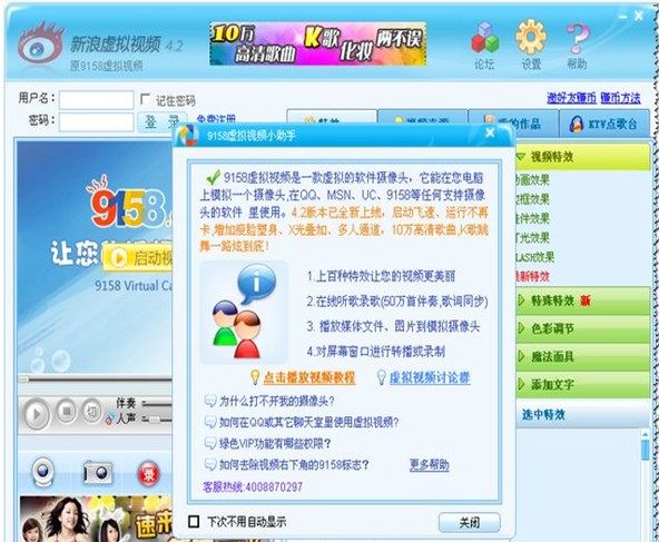 9158虛擬視頻官方下載是一款虛擬的軟件攝像頭,適用于可視頻聊天的所有軟件(QQ、MSN、UC、9158聊天室等),外掛上百種特效,可對屏幕進行轉(zhuǎn)播或錄制,集聽歌、錄歌、播放視頻圖片于一體,收錄10萬首最新、最全的高質(zhì)高清歌曲,是網(wǎng)絡上最大的大眾娛樂K歌軟件!另外9158虛擬視頻官方下載軟件還與9158多人視頻網(wǎng)站互動,只需免費注冊一下,就能輕松擁有在線拍照、視頻相冊、視頻游戲等9158的所有功能。