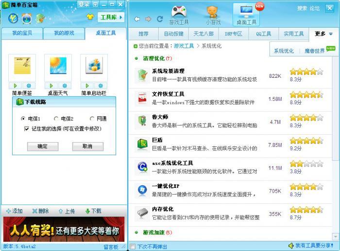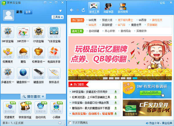 簡單百寶箱是一個免費、綠色和安全的游戲軟件分享平臺,提供國內最熱門的DNF、CF、天龍3、魔獸世界等游戲熱門工具下載。簡單百寶箱堅持免費、綠色的設計理念,按照游戲玩家使用習慣精心打造,免除玩家尋找游戲軟件或者游戲攻略的煩惱。