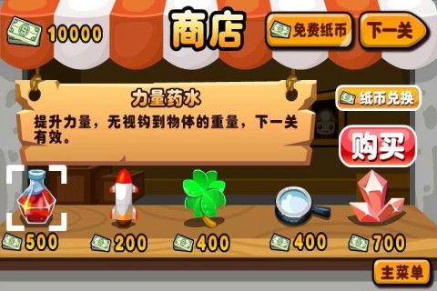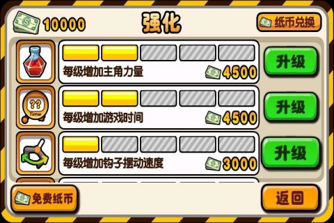 1、鉤子擺動(dòng)中,點(diǎn)擊屏幕抓取黃金。2、購買使用道具。