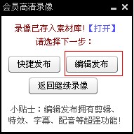 4:停止保存、發(fā)布、編輯錄像 點停止錄像后,片段自動保存到“素材庫-視頻素材”,編輯界面左側可見。時間不足10秒的錄像將自動丟棄;按F11可再開始錄制新一段。點小鉛筆進入編輯界面,編輯后發(fā)布的作品最長15分鐘;也可選擇快捷發(fā)布(不編輯直接發(fā)布),但只取前5分鐘。