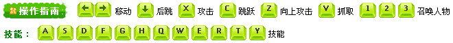 鍵盤方向鍵←→控制移動,↓鍵后跳,X鍵攻擊,C鍵跳躍,Z鍵向上攻擊,V鍵抓取攻擊,數(shù)字鍵123召喚人物。