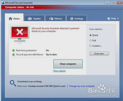 您可以選擇計(jì)劃掃描的運(yùn)行時(shí)間,在清理開始之前查看掃描結(jié)果,或運(yùn)行按需掃描。如果電腦在計(jì)劃掃描的預(yù)定運(yùn)行時(shí)間未啟動,Microsoft Security Essentials 則會在電腦啟動并閑置之后盡快開始掃描。