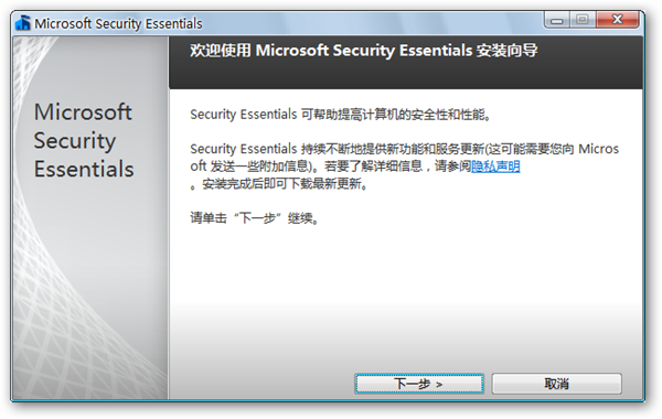 MSE會啟動安裝程序(還是英文版安裝界面,這里一步步指導(dǎo)),第一個(gè)安裝界面上的文字告訴我們MSE的作用,大意是能夠幫助提升你的電腦安全性能,點(diǎn)擊“Next(下一步)”按鈕繼續(xù)。