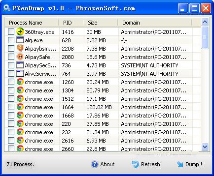 PZenDump是一款內(nèi)存轉(zhuǎn)儲文件生成軟件,它是小巧而又功能強(qiáng)悍的軟件,可刷出你內(nèi)存中的所有進(jìn)程,點擊dump將其轉(zhuǎn)儲為.dmp格式的文件。