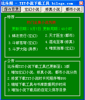 比樂(lè)閣小說(shuō)下載工具是集數(shù)萬(wàn)部txt全集小說(shuō)為一體的小說(shuō)下載工具,內(nèi)含小說(shuō)數(shù)據(jù)庫(kù)在每次運(yùn)行時(shí)與服務(wù)器對(duì)比更新,讓書(shū)友們可以獲取最新的好看小說(shuō)。在找到好看的小說(shuō)之后鼠標(biāo)點(diǎn)擊即可進(jìn)行一步下載到位,自定義保存下載后的路徑。本工具更多功能將陸續(xù)添加,敬請(qǐng)關(guān)注!