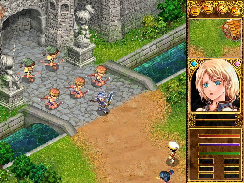 首先左邊的橋頭和右邊的河邊的敵人先會向中間靠攏,然后盟軍在最左邊的那個人肯定是保不住了,因為敵人的一次攻擊就有300多,幾個人一圍他肯定活不下來,所以也不用可惜,然后就是赫拉瞎跑,由于赫拉的職業(yè)是騎士,行動速度很高,而且她總亂跑,所以牧師就要追著她加血,而牧師又很容易死,沒有辦法了,這個時候也顧不上這些,在三個回合后,兩邊的人就能夠交手,當(dāng)然敵人非常的強,用人海戰(zhàn)術(shù)圍她們,先打占星師一類能夠加血的職業(yè),然后才是戰(zhàn)士,多利用三個高等級的職業(yè)。等到周圍的散兵游勇都消滅干凈后,就可以向中間的那6個人出發(fā)了,她們其中有一名召喚師,能夠召喚怪獸大面積的攻擊,而且攻擊力超強,于是在靠近中間這部分?jǐn)橙说臅r候千萬不要太集中,否則就是集體的毀滅性攻擊,當(dāng)然本場戰(zhàn)斗中傷亡可能也是最嚴(yán)重的,筆者最好的一次也只留下了6個人,其他的人幾乎被秒殺,當(dāng)然本場戰(zhàn)斗的另一個難度就是要保護妮雅和赫拉。最好讓妮雅學(xué)會加血技能,這樣可以專心照顧赫拉,終于將瑪西亞打倒。