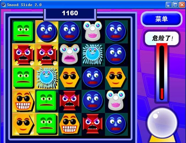 怪臉挪移(Snood Slide)是一個(gè)全新的益智消除游戲。你的目標(biāo)是把整個(gè)板面變成金色,通過形成三個(gè)或三個(gè)以上相同怪臉的組合來辦到。你能成行或成列地挪動(dòng)以形成怪臉的組合。但是要提防可能阻礙你行動(dòng)的骷髏頭!這些骷髏頭是由部分怪臉變成的,消除骷髏頭周圍的怪臉可以使它裂開以至碎掉。游戲進(jìn)行中還會(huì)出現(xiàn)超大的怪臉以增加難度。點(diǎn)擊水晶球提示時(shí)會(huì)有機(jī)器人出來替你完成一次操作,讓你在難度較高的關(guān)卡不至于無所適從。