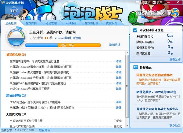 游戲優(yōu)化大師泡泡戰(zhàn)士專版,強(qiáng)大的一鍵優(yōu)化功能,更少的資源占用,讓您的游戲體驗(yàn)更加暢快!