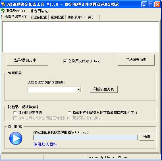 U盤視頻綁定加密工具可以加密各種視頻音頻格式文件(wmv, wma, avi, asf, mpg, rm, rmvb, mp4, flv, mp3, dvd, vcd, mov, mkv, mpeg等等,只要裝上相關解碼器可以支持各種視頻格式),加密后的文件可以綁定到你指定的硬盤或U盤里面播放,用戶無法將硬盤或U盤里面的文件復制到其他地方播放;
