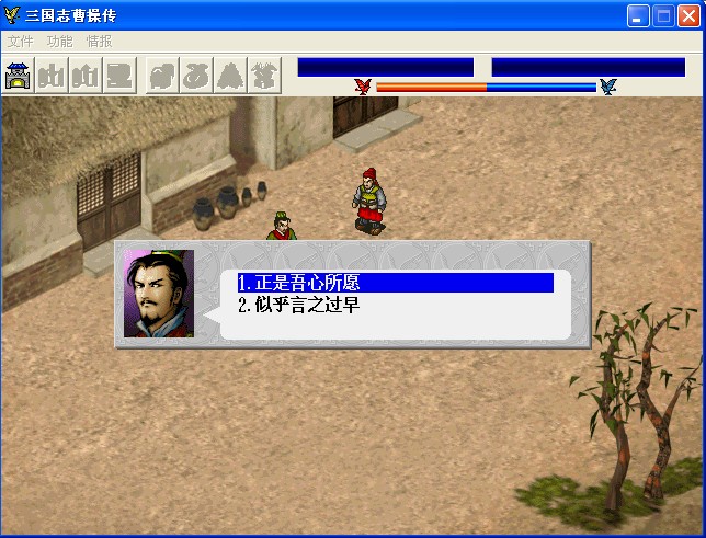 當(dāng)這個值的藍(lán)色達(dá)到15時,也就是沒有紅色的時候。游戲?qū)⑦M(jìn)入英雄路線。曹操收關(guān)羽、大戰(zhàn)魔化孔明。游戲通關(guān)得到藍(lán)色銅雀。