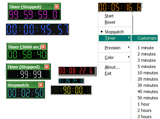 LYZ Stopwatch and Timer(桌面倒計(jì)時(shí)器) 1.6.3 官方版 LYZ Stopwatch and Timer是一款桌面版倒計(jì)時(shí)器,界面可無限放大,雙擊隱藏標(biāo)題欄,可選擇精度為1/100秒,1/10秒 , 1秒,無法更換字體。支持命令行,參數(shù) -mode=timer:100 即倒計(jì)時(shí) 100 秒,預(yù)先設(shè)置好可快速啟動(dòng)。