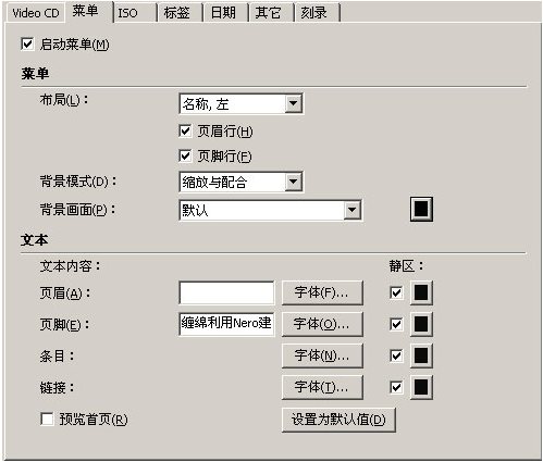 編碼分辨率要根據(jù)你的視頻文件是什么制式來選擇,中國和歐洲地區(qū)的都可以選PAL,美國和日本等地區(qū)選NTSC。在新版的NERO中加入了啟動菜單設(shè)置這一個性設(shè)置選項,如圖