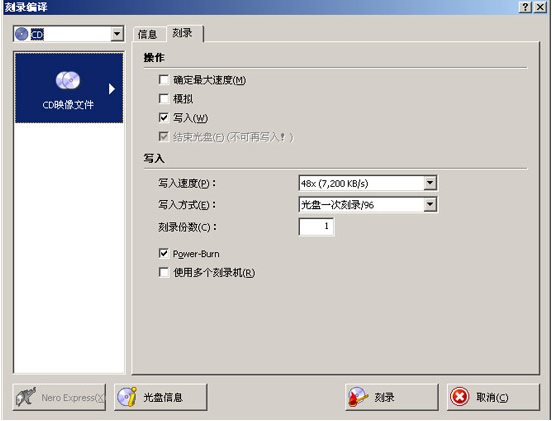 切換到“刻錄”設(shè)置選項,可選擇刻錄速度及刻錄方式等,如圖