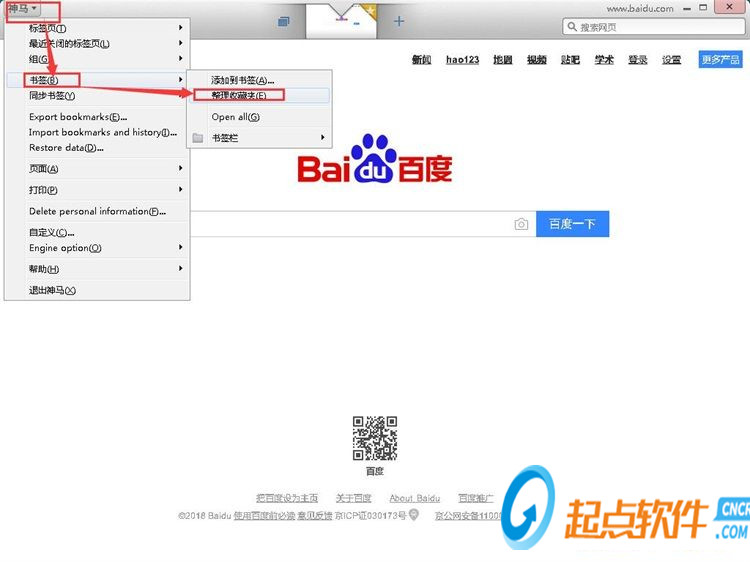 接下來我們可以刪除書簽欄中不需要用到的書簽。點(diǎn)擊瀏覽器主界面左上角的選項(xiàng)按鈕,就可以打開瀏覽器功能菜單。點(diǎn)擊菜單中的書簽,展開書簽菜單。點(diǎn)擊書簽菜單中的管理收藏夾,就可以打開瀏覽器的整理收藏夾窗口,管理網(wǎng)頁書簽;