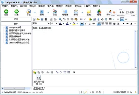dailypim是一款個(gè)人日常信息管理的軟件,目前具有的功能有日記本、資料管理、文件管理、日程管理、地址簿、網(wǎng)頁快抓、郵箱遠(yuǎn)程管理、即時(shí)通訊、便箋、天氣預(yù)報(bào)、火車查詢、航班信息、電話區(qū)號(hào)、郵政編碼、定時(shí)關(guān)機(jī)、萬年歷等。