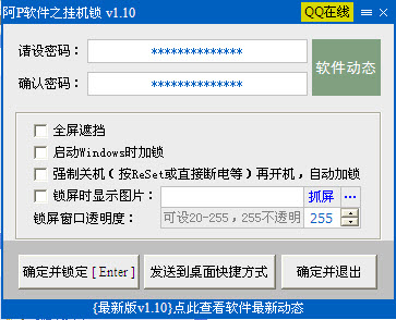 阿P軟件之電腦掛機(jī)鎖有“全屏鎖屏”和“迷你鎖屏”兩種方式供用戶選擇,不影響用戶電腦上已經(jīng)運(yùn)行的任何程序,其中“全屏鎖屏”時(shí)基本不影響用戶使用第三方軟件掛機(jī)打游戲等。用戶可設(shè)置鎖屏窗口透明度及背景圖片。鎖屏?xí)r屏蔽系統(tǒng)任務(wù)管理器、Alt+F4及Alt+Tab組合鍵以及Windows徽標(biāo)鍵,確保不被破解,保證掛機(jī)安全。用戶設(shè)置過(guò)密碼后,再次運(yùn)行時(shí)直接鎖屏,省卻設(shè)置密碼的繁瑣。可設(shè)置開(kāi)機(jī)自啟動(dòng)、強(qiáng)制關(guān)機(jī)后再開(kāi)機(jī)自啟動(dòng)等。程序不寫注冊(cè)表,綠色免安裝,占內(nèi)存極少。