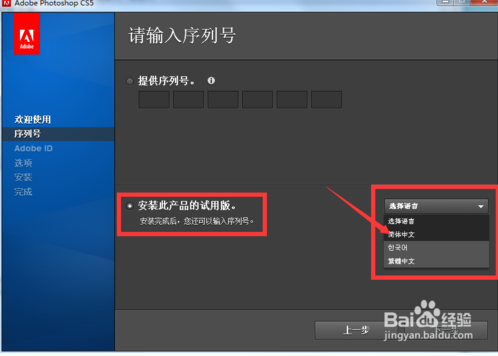 2、選擇"安裝此產(chǎn)品的試用版",語言選“簡體中文”,序列號先跳過;