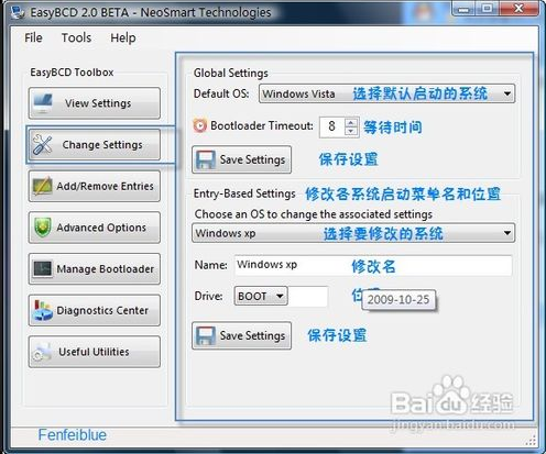 2.在ChangSettings里可以修改你需要設(shè)置默認(rèn)啟動(dòng)的系統(tǒng),和啟動(dòng)菜單的名字。有時(shí)候添加啟動(dòng)項(xiàng)之后,在ViewSetting里看到系統(tǒng)所在的盤(pán)符沒(méi)有識(shí)別正確,在這里可以修改。安裝完xp再安裝vista/7會(huì)把xp的啟動(dòng)項(xiàng)識(shí)別為較早的windows,在這里也可以該過(guò)來(lái)。