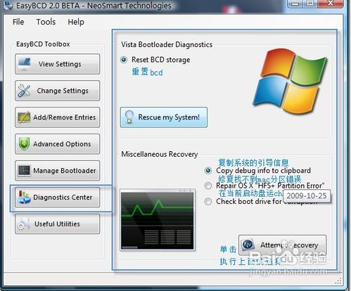 6.第一項(xiàng)可以修復(fù)BCD,沒(méi)用過(guò),不過(guò)我想功能應(yīng)該是bcdboot(bcdboot.exe介紹見(jiàn)最后)一樣的。單擊RescuemySystem會(huì)提示你選擇vista所在的分區(qū)盤(pán)符。下面給了三個(gè)小功能,第一個(gè)是復(fù)制系統(tǒng)的引導(dǎo)信息,第二個(gè)會(huì)嘗試修復(fù)HFSPartitionError錯(cuò)誤,這個(gè)錯(cuò)誤以前比較多,好像現(xiàn)在很少了,我遇到過(guò)一次,可是他沒(méi)修復(fù)好。最后一個(gè)就是運(yùn)行Chkdsk來(lái)檢查修復(fù)啟動(dòng)盤(pán)。