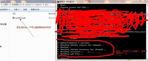8、 回編譯,CMD窗口輸入apktool b systemui(回車)出現(xiàn)下面畫面,你就有希望成功了。