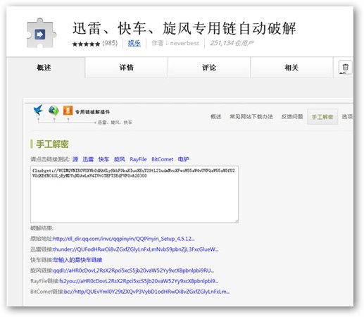 迅雷、快車、旋風專用鏈自動破解是一款自動把頁面里的迅雷Thunder,快車Flashget,旋風QQDownload鏈接替換成真實地址,這樣就可以使用任意工具去下載專用鏈接。