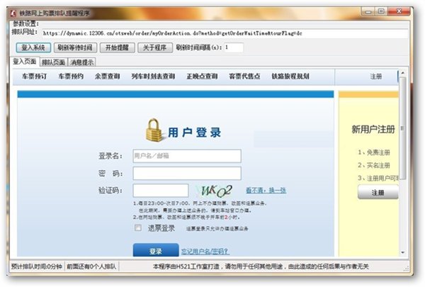 鐵路網(wǎng)上購票排隊(duì)提醒器是為了給買火車票的用戶及時(shí)提醒前面剩余的排隊(duì)人而研發(fā)的實(shí)用小軟件,送給有需要的朋友。