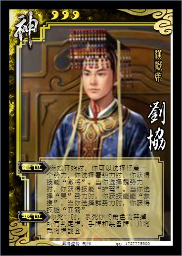 殉志: 出牌階段,可摸三張牌并變身為任意未上場或已陣亡的蜀勢力角色,若如此做,回合結(jié)束時你立即死亡