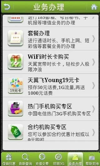 提供充值卡充值及翼支付功能,可進行相關(guān)費用及賬單的支付。
