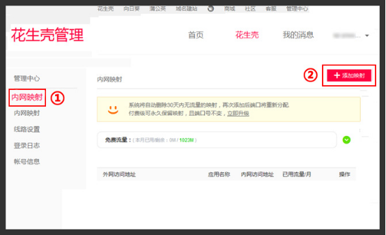3、點擊客戶端內(nèi)網(wǎng)映射,則跳轉(zhuǎn)至花生殼管理的內(nèi)網(wǎng)映射頁面,