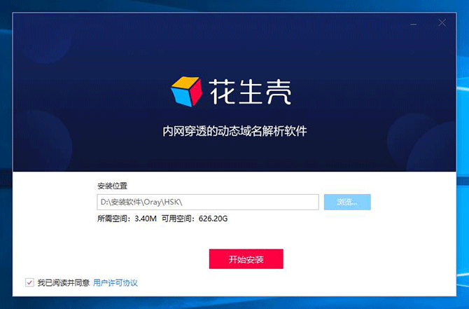 一、安裝花生殼(內(nèi)網(wǎng)穿透)1、下載花生殼(內(nèi)網(wǎng)穿透)客戶端后,打開運行文件,進入安裝向?qū)А?br />2、選擇安裝位置,更換目標文件夾可點擊瀏覽(若是已安裝過的則自動默認目標文件夾,無法更改位置,只需卸載之前的版本即可;若是未安裝過的則可以直接點擊瀏覽更改位置),接著完成安裝步驟。