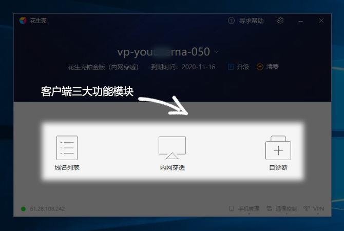 客戶端主界面有三大功能模塊,分別是域名列表、內(nèi)網(wǎng)映射和自診斷。