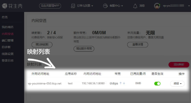 ①點擊【內(nèi)網(wǎng)穿透】——【添加映射】