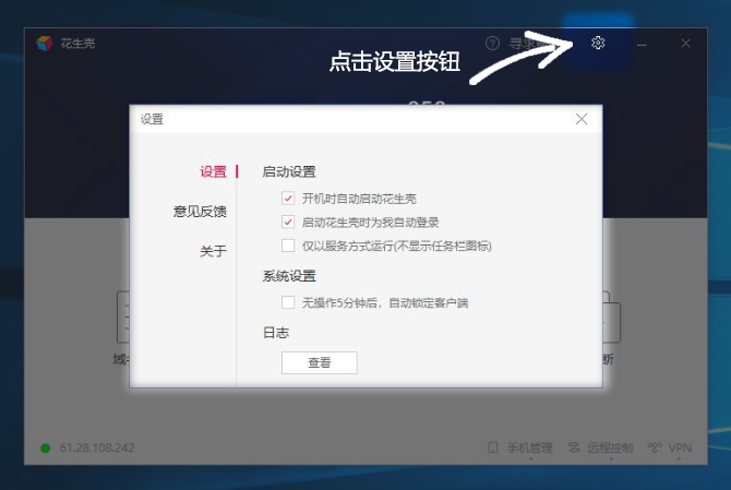 5、點擊右上方的“設(shè)置”按鈕,可進行相關(guān)設(shè)置,如開機啟動、是否以服務方式運行、是否自動鎖定客戶端等等。
