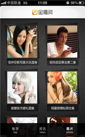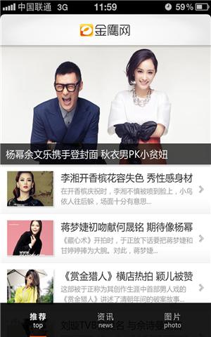 金鷹網(wǎng)手機(jī)客戶端作為一款精致時(shí)尚的娛樂(lè)新聞?lì)悜?yīng)用,通過(guò)電視劇、綜藝、電影、音樂(lè)四大專業(yè)頻道,金鷹資訊結(jié)合優(yōu)質(zhì)高清的圖片頻道,為用戶隨時(shí)隨地提供新鮮有料的娛樂(lè)資訊,讓用戶成為玩轉(zhuǎn)娛樂(lè)圈的最in潮人。