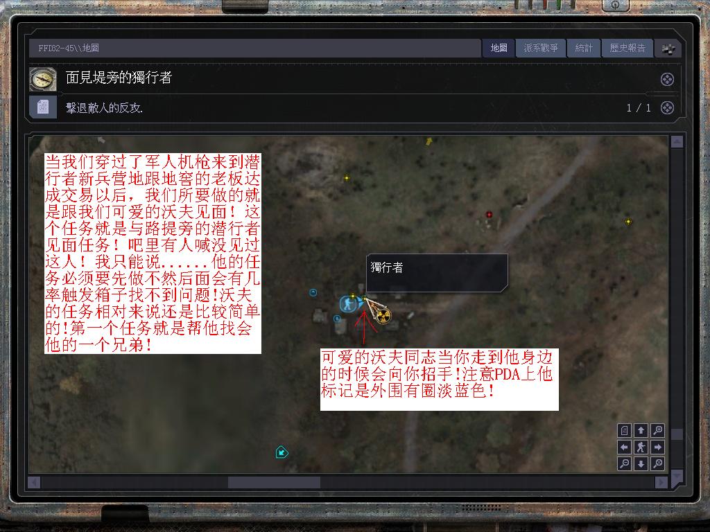 任務(wù)很簡單!接到任務(wù)以后速度跑到PDA指示地點(diǎn)消滅變異生物保護(hù)好沃夫的小弟然后護(hù)送他回營地跟沃夫交任務(wù)就行了!