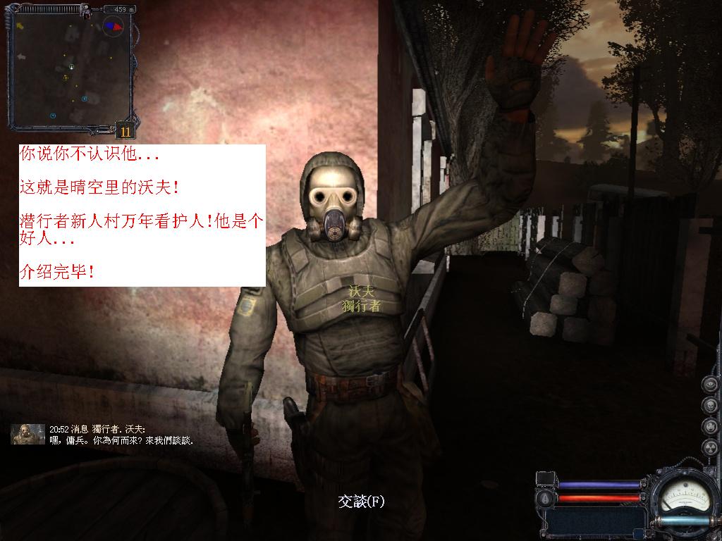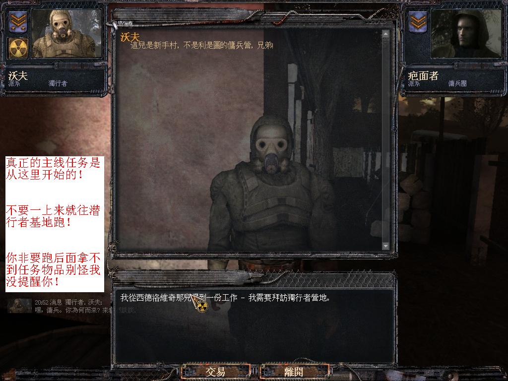 經(jīng)過上述任務(wù)以后我們要做的就是跟隨PDA去老西的地窖里接受任務(wù)!接好以后不要直接去潛行者基地!我們在新人村還有一件很重要的事情要做!那就是會見我們可愛的沃夫同志!任務(wù)提示會見路提旁的潛行者就是他了!