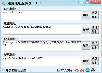 通用地址轉(zhuǎn)換器全面支持:Http、Ftp、ed2k、迅雷、快車(chē)、QQ旋風(fēng)專(zhuān)用下載地址的解析和加密。并且支持系統(tǒng)剪切板自動(dòng)監(jiān)控!通殺迅雷、快車(chē)、QQ旋風(fēng)專(zhuān)用下載地址。