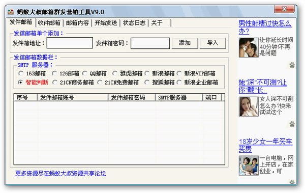 螞蟻大叔郵箱群發(fā)營銷工具 9.0 綠色版 螞蟻大叔郵箱群發(fā)工具是目前最有效最快速的網(wǎng)絡(luò)營銷和郵件群發(fā)軟件宣傳工具!