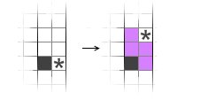 因此,僅含有“S”形方塊的循環(huán)只有一種情況——“S”形方塊在各個通道內(nèi)重疊,填滿并消除若干行后回到初始狀態(tài)。實際循環(huán)區(qū)內(nèi)的每個通道都是一個模樣:底下是0個或多個“■■”,頂部一個“■□”。注意,最右側(cè)那個通道的最頂端是一個“■□”,右邊這個空白一輩子也不可能用“Z”形方塊填上。也就是說,在一個只含“S”形方塊的循環(huán)區(qū)內(nèi),必然會有某一行,它的最右側(cè)是一個“■□”,它保證了該行不能僅用“Z”形方塊消掉。如圖6所示,箭頭所指的行無法單用“Z”形方塊消除,因為星號位置不可能用“Z”形方塊填充。