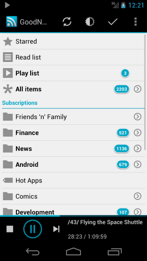 真正是一個(gè)新聞閱讀器(RSS/ATOM)和音頻播客播放器與著名的谷歌閱讀器完全同步。古德紐斯擁有現(xiàn)代化的用戶(hù)界面,它提供了大量的專(zhuān)業(yè)和獨(dú)特的新聞閱讀器的功能,包括離線支持(包括圖像),自動(dòng)推送的局部變化,閱讀的文章列表,訂閱分組列表,標(biāo)識(shí)出上滾動(dòng),自動(dòng)關(guān)閉視圖,音量鍵導(dǎo)航,多了不少。超過(guò)50個(gè)選項(xiàng),可讓您完全按照您的需求定制好的消息。