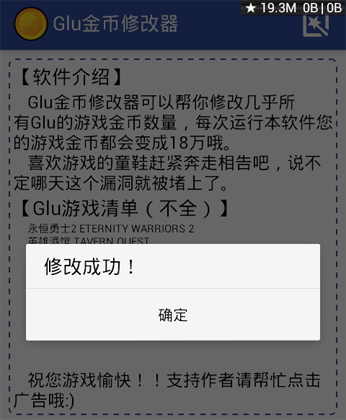 5、修改成功后會出現(xiàn)下圖的界面。現(xiàn)在我們進(jìn)入GLU的游戲,就會發(fā)現(xiàn)GLU幣的數(shù)量已經(jīng)變?yōu)榱?90萬,注意,游戲的時候不要聯(lián)網(wǎng)。