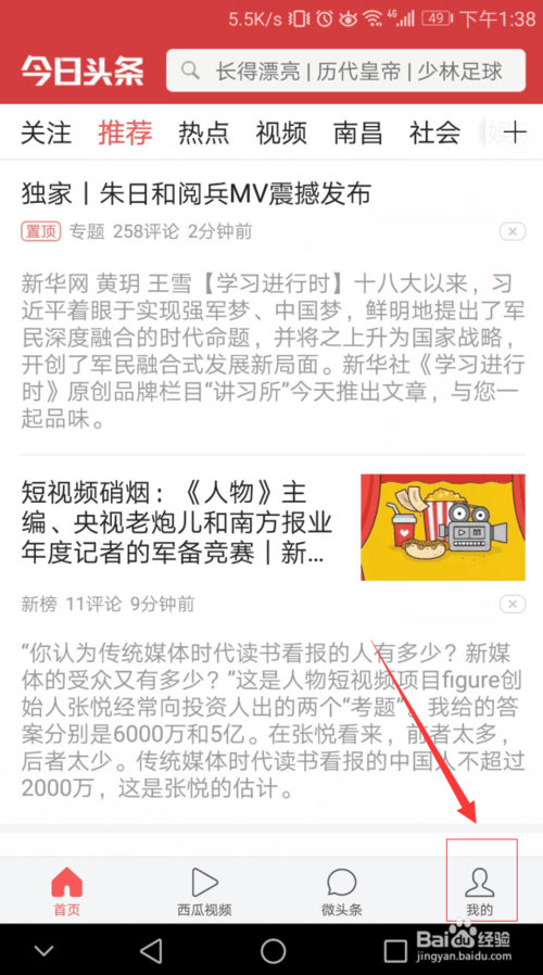 接著來到了頭條的首頁,我們點擊“我的”,如圖。